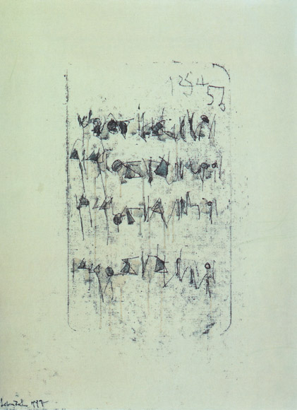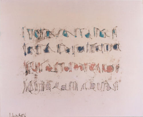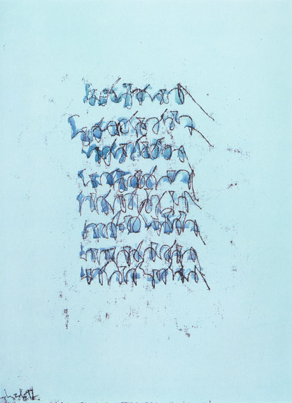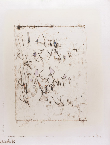 Segni si imprimono nello spazio, segni ripetuti, iterazioni della ricerca. La sperimentazione del tempo, il mondo sfuggente del bios si cristallizza nella linea, nella traccia. La metamorfosi sublima ciò che dispare, l'intuizione, in essenza che permanga, divenga memoria e superi il confine. L'esperienza si traduce in segno, diventa parola per tornare ad essere segno, infine si compie in eikon. La storia di un percorso inverso, un processo rovesciato che ridiscende al momento d'inizio.